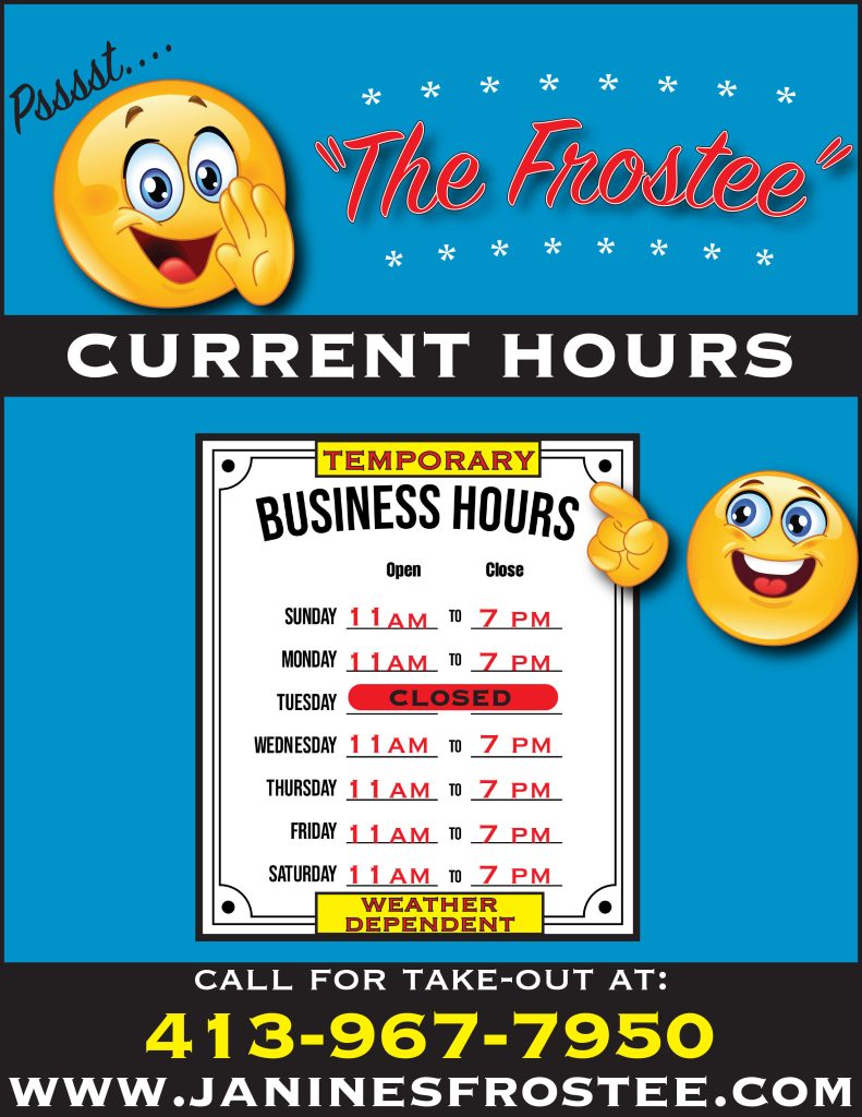 We will be OPEN on Easter Sunday from 2pm - approx 7pm. We will be serving ONLY ice cream !!! We will be serving all of our ice cream selections, and maybe a couple special sundaes too ! Be sure to swing by after your family dinner for some delicious dessert at The Frostee.